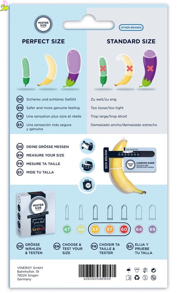 Mister Size to niemiecka marka prezerwatyw, która wyróżnia się możliwością precyzyjnego dopasowania kondomów do Twojego indywidualnego rozmiaru. W zestawie znajdziesz trzy prezerwatywy o różnych rozmiarach (53 mm, 57 mm, 60 mm) oraz innowacyjny tester rozmiaru, który pozwoli Ci na wybór idealnie dopasowanego produktu. Dopasowanie ma kluczowe znaczenie dla komfortu i bezpieczeństwa podczas stosunku, a Mister Size wychodzi naprzeciw tym potrzebom.